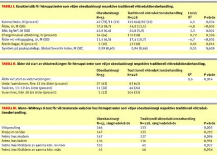 I Tabell I–III visas karakteristika för patienter som valde kirurgi och för dem som valde traditionell viktreduktionsbehandling. Statistiskt signifikanta skillnader mellan grupperna ses för flera av de undersökta variablerna. Det finns en könsskillnad för de två typerna av behandling. Kvinnorna valde kirurgi framför traditionell behandling i högre utsträckning än männen. Vidare var kirurgpatienterna yngre, och de vägde mer. De hade också lägre ålder vid start av viktutvecklingen, cirka 11 år jämfört med cirka 17 år för patienterna som valde traditionell behandling.