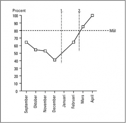 Andel mål som var formulerade på ett korrekt sätt framgår av Figur 1. Baslinjen (vecka 41–52), dvs före intervention, visar att 30–60 procent av delmålen formulerats korrekt. Efter intervention var motsvarande siffror 80–100 procent.