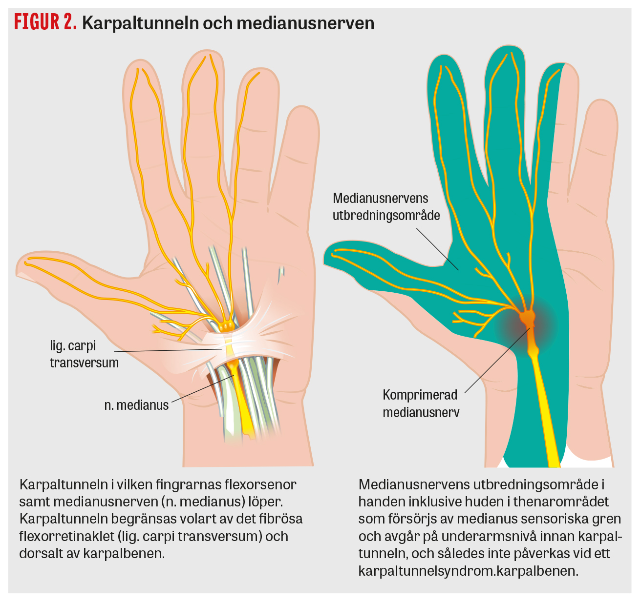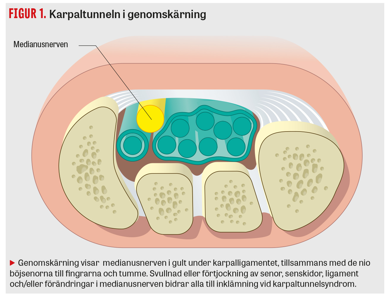 Karpaltunnelsyndrom är den vanligaste perifera nervinklämningen i övre extremiteten och drabbar runt 5 procent av befolkningen någon gång i livet [3]. Diagnosen är vanligast hos medelålders kvinnor, och prevalensen ökar med stigande ålder. Tillståndet uppstår när det blir för trångt i medianusnervens passage genom karpaltunneln, som begränsas av karpalbenen nedåt och det transversella karpalligamentet ovan (Figur 1 och 2). Tillsammans med nerven löper också fingrarnas och tummens nio böjsenor genom karpaltunneln. Symtomen inkluderar domningar och stickningar, känselbortfall, fumlighet och smärta framför allt i medianusinnerverade fingrar men med variation. Patofysiologin är multifaktoriell, och kända riskfaktorer inkluderar diabetes, övervikt, graviditet, reumatoid artrit, hypotyreos [4] och genetisk predisposition [5].