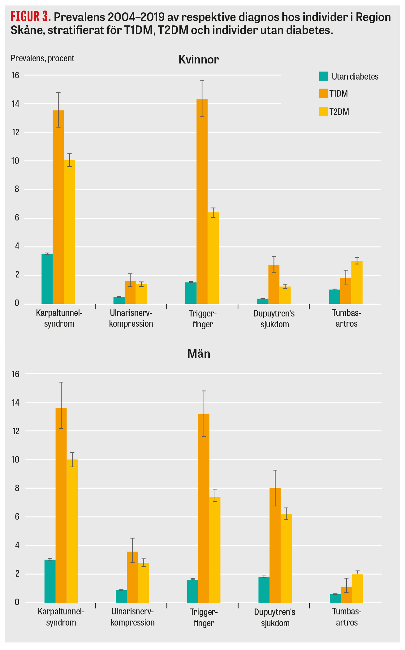Dupuytrens sjukdom är en bindvävssjukdom som drabbar palmarfascian i handflatan. Den beskrevs första gången redan 1614 av läkaren Felix Platter, verksam i Schweiz, som felaktigt förlade patologin till böjsenorna. Guillaume Dupuytren (1777–1835), vars namn kom att förknippas med sjukdomen, beskrev den korrekta anatomin och banade också väg för de kirurgiska ingrepp som fortfarande används i dag [16]. Prevalensen varierar kraftigt beroende på geografisk region, studerad population och diagnoskriterier. Sjukdomen diagnostiseras oftast vid 70–80 års ålder, är vanligare bland män och upp till 7–8 gånger vanligare bland individer med diabetes [17] (Figur 3). Sjukdomen har kallats för »vikingasjukan« på grund av en hög prevalens i nordiska länder och tanken om ett genetiskt ursprung bland nordbor, vilket nyligen ifrågasatts. Nya studier har inte kunnat bevisa ett nordeuropeiskt genetiskt ursprung till sjukdomen [18]. Orsaken bakom Dupuytrens sjukdom är multifaktoriell med både ärftliga, miljömässiga och metabola riskfaktorer, inklusive diabetes, rökning, alkoholkonsumtion, hypertoni och manuellt arbete [19]. Sjukdomen börjar oftast med en nodulus i handflatan som omvandlas, med stor individuell variation, till bindvävssträngar, vilka ger en extensionsdefekt i drabbat finger, oftast ringfingret. Svårigheter att ta på handskar eller hälsa med handen får vanligen patienten att söka vård.