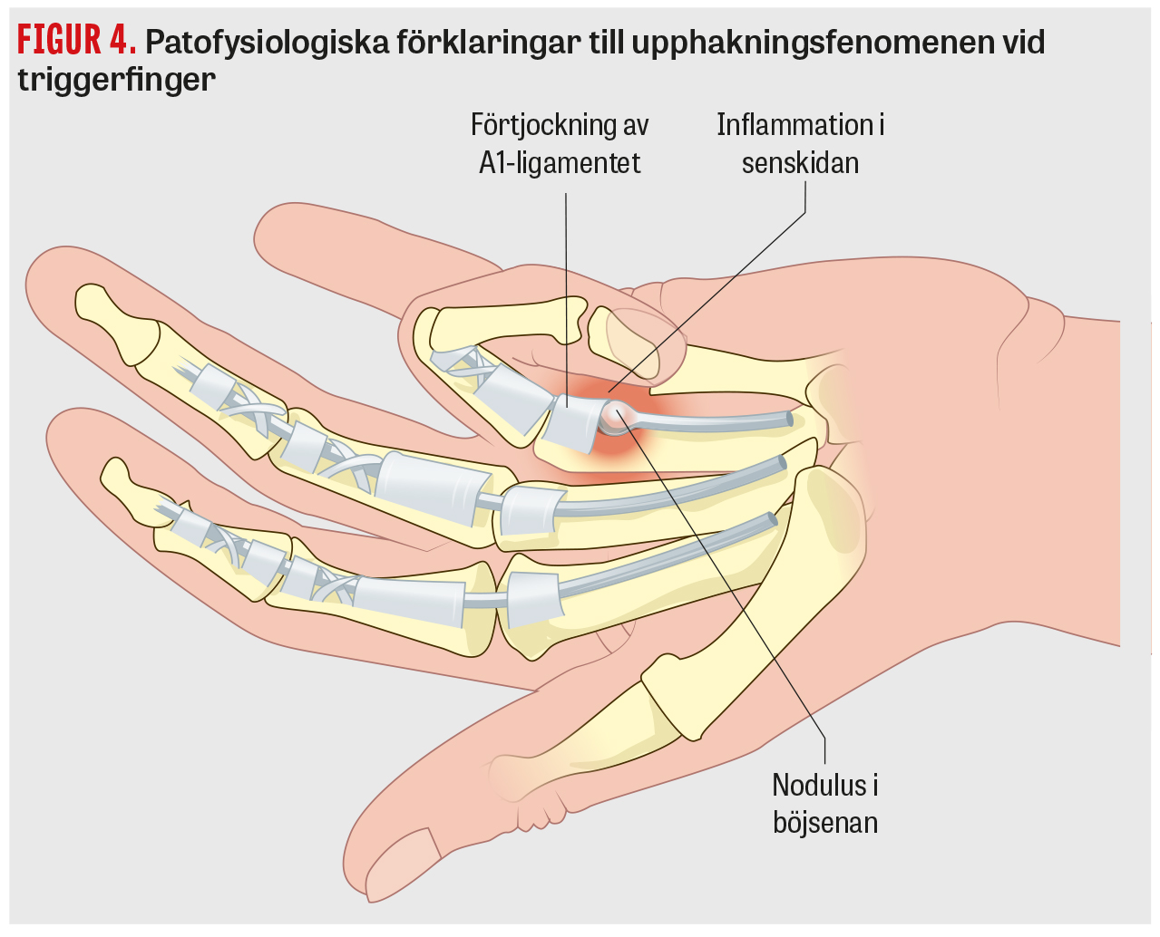 Den exakta orsaken till sjukdomen är fortfarande inte helt känd, men patologi föreligger troligen såväl i senskidan i höjd med A1-ligamentet som i böjsenorna, vilket utlöser triggerfenomenet [27]. Studier med ultraljud har visat på tjockare A1-ligament, men också tecken på tendinos och förtjockning av böjsenan [28, 29]. Biopsier från böjsenan visar histologiska tecken på både små mikrobristningar och synovial inflammation [30], fynd som potentiellt kan ha inducerats eller förvärrats av hyperglykemi vid diabetes. Biopsier från A1-ligamentet hos individer med diabetes visar också på ökad oxidativ stress samt neovaskularisering, det vill säga potentiella tecken på diabetesinducerad hypoxi, speciellt hos individer med ett dysreglerat blodsocker [31].