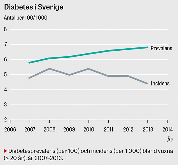 Mellan 2007 och 2013 ökade diabetesprevalensen (läkemedels- och kostbehandlad) i Sverige från 5,8 till 6,8 procent (från 5,1 till 5,8 procent bland kvinnor och från 6,6 till 7,9 procent bland män). Incidensen var stabil eller till och med minskande (4,4 per 1 000 personer år 2013). Om den nuvarande utvecklingen fortsätter (som modellerat i scenario a) kommer prevalensen fortsätta öka och nå 10,4 procent år 2050. Antalet personer med diabetes kommer att uppgå till 940 000, vilket är en ökning med 82 procent jämfört med de 516 000 personer som hade diabetes år 2013. Börjar incidensen däremot att stiga med 1 procent per år (b) kan vi förvänta oss en diabetesprevalens på 12,6 procent och 1 136 000 invånare med diabetes år 2050. Om förekomsten i stället skulle minska med 1 procent per år (c) skulle prevalensen trots det fortsätta stiga och nå 8,7 procent år 2050 med 783 000 drabbade individer.