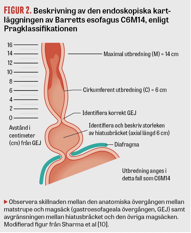 Det är viktigt för den fortsatta handläggningen av patienter med ett minst 1 cm långt körtelepitelsegment (inklusive eventuell körtelepiteltunga) proximalt om gastroesofageala övergången att den första endoskopin görs på ett korrekt sätt. Den ska ha fokus på identifiering av makroskopiska avvikelser (tumörer) och på påvisandet eller uteslutandet av intestinal metaplasi inom det metaplastiska segmentet. Avgörande är då att en systematisk så kallad förstagångskartläggning utförs. Om den ska vara pålitlig måste en eventuell esofagit först behandlas med PPI (standarddos × 2) under 8 veckor, eftersom pågående inflammation kan försvåra avgränsningen av körtelsegmentet samt bedömningen av eventuella dysplastiska förändringar. Segmentet beskrivs enligt Pragklassifikationen och anges som CxMx (Figur 2). Varje endoskopi på en patient med misstänkt Barretts esofagus måste utföras mycket noggrant [41]. Ett riktmärke ska vara att varje centimeter av körtelepitelsegmentet inspekteras under minst 1 minut. Det är viktigt att vara medveten om att dysplastiska förändringar har en högre benägenhet att utvecklas i synfältet (med patienten i vänster sidoläge) mellan klockslagen 12 och 03. I enlighet med Seattleprotokollets anvisningar [18] tas kvadrantbiopsier med en »jumbotång« med sugteknik på varannan centimeter av segmentet. I händelse av att låg- eller höggradig dysplasi påvisas ska diagnoser alltid bekräftas av specialiserad GI-patolog (Fakta 1).