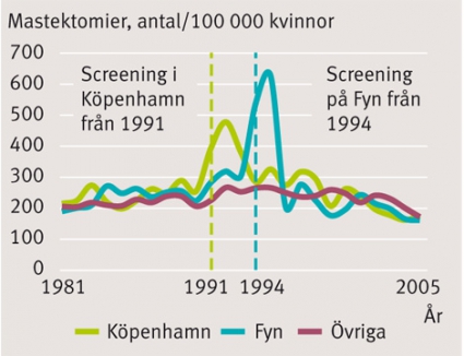 Likväl reducerades bröstcancerdödligheten i Danmark under 1989–2006 med 49 procent bland kvinnor under 50 år mot 36 procent i Sverige [8]. Detta trots att hälften av svenska kvinnor i åldern 40–49 år erbjuds screening men inga i denna åldersgrupp i Danmark. I gruppen 50–69 år var reduktionen 26 procent i Danmark och endast 16 procent i Sverige. I Sverige har den årliga minskningen i denna åldersgrupp varit oförändrad sedan 1972 [9], vilket inte heller tyder på någon effekt av screening.