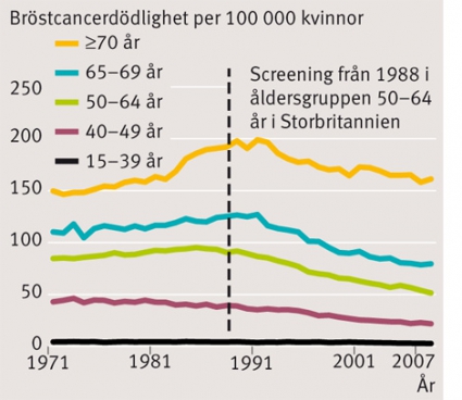 Andra viktiga studier har tillkommit. En studie av bröstcancerdödligheten i 30 europeiska länder under perioden 1989–2006 visade att dödligheten minskade med 37 procent bland kvinnor under 50 år (som generellt inte hade screenats) och med bara 21 procent bland kvinnor i åldern 50–69 år (som oftast inbjöds till screening) [8]. Ingen säker reduktion av dödligheten i bröstcancer kunde noteras bland kvinnor över 70 år. Detta motsvarar våra fynd från Danmark [7].