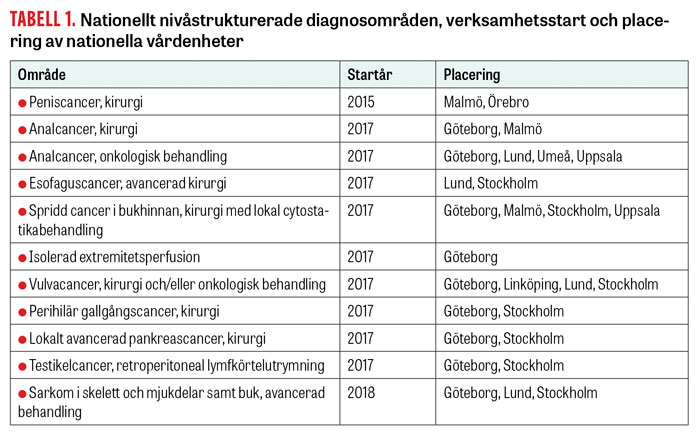Inom ramen för den nationella cancerstrategin och genom överenskommelser mellan regeringen och Sveriges Kommuner och regioner (SKR) har Regionala cancercentrum (RCC) i samverkan haft uppdraget att arbeta med nationell nivåstrukturering av cancervården [1]. Uppdraget har inneburit att koncentrera vård som är ovanlig, komplicerad eller särskilt resurskrävande till högst fem vårdgivare i landet. Under perioden 2014–2018 har samtliga regioner fattat samstämmiga beslut om nationella vårduppdrag inom 10 diagnosområden som fördelats på 28 nationella vårdenheter vid de sju universitetssjukhusen, Tabell 1. I RCC:s uppdrag har även ingått uppföljning av verksamheterna.