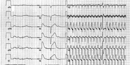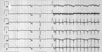 Fall 2 rör en 77-årig kvinna som vid ankomsten hade central bröstsmärta som debuterat i samband med att hon misshandlats av sin drogpåverkade son. Hon var väsentligen frisk, förutom att hon hade medicinering med protonpumpshämmare mot epigastralgier vid behov. På EKG noterades ST-höjningar i avledningarna V2–V4 vid ankomsten och påföljande dag tillkomst av T-invertering i flertalet avledningar (Figur 4).