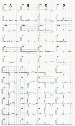 De vanligast förekommande tidiga EKG-förändringarna som beskrivits i rapporterade patientserier är ST-höjningar, främst i prekordialavledningarna. Dessa akuta förändringar kan inte skiljas från dem vid akut anterior hjärtinfarkt [17]. Återkommande i publicerade patientserier är en successiv utveckling av dels T-vågsinvertering i flertalet avledningar, dels förlängning av QT-intervallet. I en belgisk studie noterades normalt ankomst-EKG hos fem av 13 inkluderade patienter [8]. Samtliga patienter utvecklade dock T-vågsinvertering inom ett par dygn. T-vågsförändringarna tycks vanligen kvarstå i veckor eller månader, medan QT-tiden normaliseras efter några dygn [5]. Utveckling av Q-vågor i akutskedet har rapporterats hos enstaka patienter, och i vissa fall har dessa Q-vågor varit övergående [3, 9]. Nytillkommen EKG-förändring (ST-höjning eller T-vågsinvertering) ingår som ett av fyra diagnostiska kriterier som Bybee och medarbetare föreslagit (Fakta 1) [15].