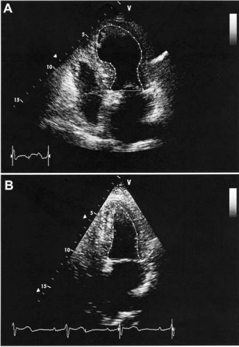 Ekokardiografiskt ser man typiskt dilatation och utbredd kontraktionsnedsättning i vänster kammares apikala halva (Figur 5 A). Väggrörligheten i den basala kammarhalvan är oftast normal eller hyperkontraktil. Ejektionsfraktionen är vanligen reducerad i det akuta skedet. Hyperkontraktilitet i de basala delarna av vänster kammare kan i vissa fall ge upphov till en subvalvulär obstruktion i vänster kammares utflödesområde [11]. Denna utflödesobstruktion kan förvärras av inotrop behandling och leda till hypotension.