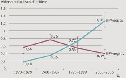 Baserat på dessa data, nationella cancerregistret och cancerregistret i Stockholm–Gotlandsregionen har vi gjort en populationsbaserad uppskattning och funnit att HPV-positiv tonsillcancer ökat 7-faldigt och att HPV-negativ cancer minskat under perioden 1970–2006 (Figur 2). Det sistnämnda är sannolikt beroende på minskad tobaksrökning och följer kurvan för lungcancer.