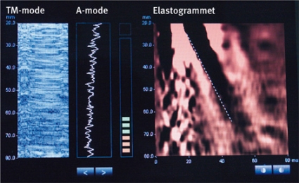 Vågens propagationshastighet genom parenkymet mäts med ultraljudstransduktorn som en pulsamplitud dels runt en axel (amplitudmodulering eller A-mode), dels som en funktion över tid (tid–rörelsemodulering eller TM-mode) (Figur 2). Elastografen har en display för både A-mode och TM-mode, så att undersökaren ska kunna värdera parenkymets struktur och se hur homogent det är.