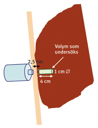 Elastografen undersöker en cylindrisk vävnadsvolym som är 1 cm i diameter och 4 cm lång (1/500 av leverns volym), vilket illustreras i Figur 3. För vuxenproben ligger mätområdet 2,5–6,5 cm från hudytan och för barnproben 1,5–4,0 eller 2,0–5,0 cm.