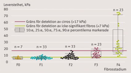I vårt material hade patienterna kronisk leversjukdom med blandad etiologi, och andelen patienter med cirros var 19 procent. Vi fann att ett gränsvärde på 17 kPa gav ett högre positivt prediktivt värde för detektion av cirros (77 procent) än ett gränsvärde på 14,5 kPa (67 procent), utan att det negativa prediktiva värdet för att utesluta cirros försämrades nämnvärt (negativt prediktivt värde 94 procent respektive 95 procent). Antalet patienter med kolestatisk leversjukdom eller alkoholinducerad leversjukdom är för litet i vårt material för att tillförlitliga gränsvärden ska kunna appliceras på dessa undergrupper. Vi föreslår därför ett gränsvärde på 17 kPa för att detektera levercirros i en svensk patientpopulation med leversjukdom av blandad etiologi.