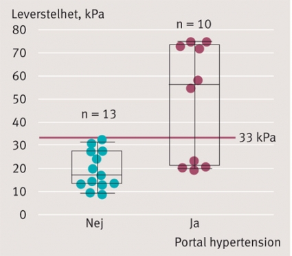 Patienter med portal hypertension hade signifikant högre värden än de med kompenserad cirros (49,3 kPa vs 19,4 kPa; P < 0,05). (Figur 6). Vid ett gränsvärde på 33 kPa är sensitiviteten 0,60 och specificiteten 1,0 för att detektera portal hypertension. Det positiva prediktiva värdet för att diagnostisera portal hypertension är då 100 procent, och det negativa prediktiva värdet för att utesluta detsamma är 76 procent.