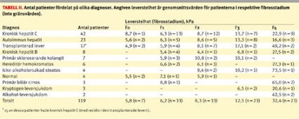 Totalt 119 patienter inkluderades i studien: 68 män och 51 kvinnor. Medianåldern var 53 år, åldersspannet 16–74 år. Sammanlagt 23 patienter (19 procent) hade cirros (F4), 23 höggradig fibros (F3) och 73 ingen eller lindrig fibros (F0–F2). Fördelningen av olika diagnoser visas i Tabell II.
