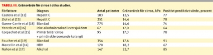 En sammanställning av beräknade gränsvärden för cirros i olika studier redovisas i Tabell III. Vanligen har dessa gränsvärden beräknats genom att maximera summan av sensitivitet och specificitet [12, 13], vilket ger något lägre gränsvärden och sämre positivt prediktivt värde än om det beräknas utifrån bästa diagnostiska prediktivitet [14]. Det positiva prediktiva värdet är också beroende av frekvensen av cirrospatienter i det undersökta materialet, där en hög andel cirrospatienter ger ett högre värde [14]. Vidare kan olika etiologier ha olika optimala gränsvärden för detektion av cirros, där hepatit C förefaller ligga lägst (12,5–14,7 kPa) och kolestatisk leversjukdom och alkoholinducerad leversjukdom högst (17,3–22,7 kPa) [12, 13, 15, 17].