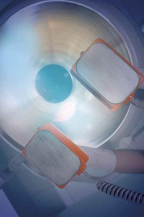 Plattornas placering och vågform. Huden ska vara ren och torr, och riklig behåring avlägsnas för att minska energiförlusterna i bröstkorgen.