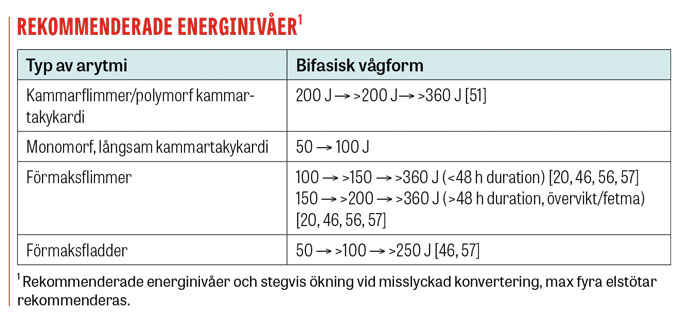 Energinivå. Patientens impedans och typen av arytmi och duration avgör energinivå. Impedansen är ett mått på motståndet för den elektriska strömmen genom bröstkorgen och är generellt högre vid större kroppsmassa och stor bröstkorg [50]. Arytmier med ursprung i lokaliserade reentrykretsar eller enskilda fokus, såsom monomorf kammartakykardi och förmaksfladder, kräver lägre energinivåer än snabba och oregelbundna rytmer såsom polymorf kammartakykardi, kammarflimmer och förmaksflimmer, eftersom en mindre andel kardiomyocyter behöver depolariseras för att bryta arytmin [21]. Lägre energinivåer kan prövas vid förmaksflimmer med kort duration, <48 timmar [20]. För defibrillering av hjärtstopp rekommenderas ökande energinivå (200 J → >200 J → >360 J) [51].