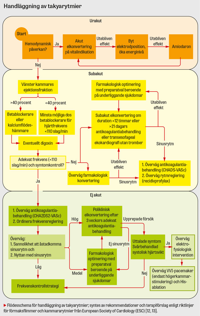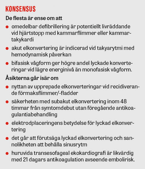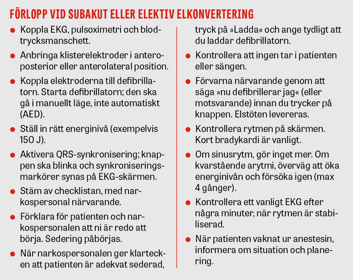 Elkonvertering. Akut elkonvertering utförs vid kammartakykardi eller förmakstakykardi med hemodynamisk påverkan, symtomgivande ischemi eller betydande inkompensation, som inte svarar på eller är lämpliga för frekvensreglerande eller konverterande läkemedelsbehandling [11–13]. Den hemodynamiska påverkan av en arytmi beror på frekvens och underliggande sjukdomar, men elkonvertering är oftast det bästa alternativet, eftersom det är effektivt och säkert [12].
