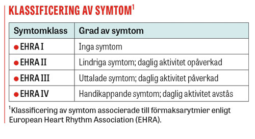 Vid nytillkommet eller recidiverande förmaksflimmer där patienten är symtomatisk rekommenderas elkonvertering, som åstadkommer sinusrytm i 67–95 procent av fallen [13-15]. För patienter med mycket frekvent recidiverande eller persisterande förmaksflimmer/-fladder utan symtom är indikationen för upprepade elkonverteringar däremot tveksam. EHRA (European Heart Rhythm Association)-skalan kan användas för att kategorisera arytmirelaterade symtom.