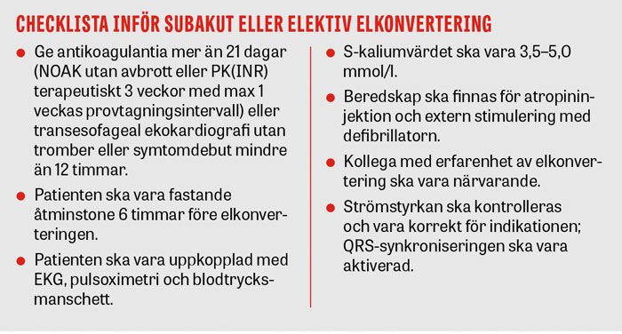 Vid elektiv eller subakut elkonvertering är det viktigt att säkerställa att patienten har låg risk för tromboembolism. Detta kan antas vara fallet om