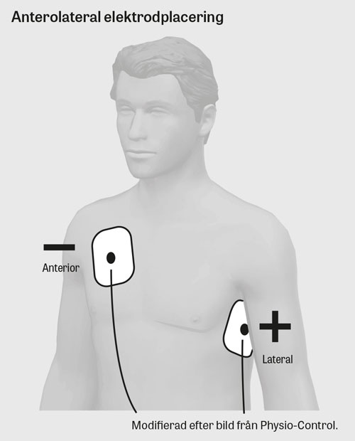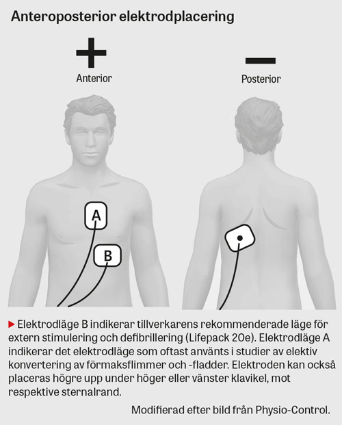 En systematisk litteraturöversikt om förmaksflimmer och -fladder kunde inte påvisa någon signifikant skillnad i konverteringsfrekvens eller komplikationer, och enskilda randomiserade studier har visat motstridiga resultat [14, 43-45]. Europeiska kardiologföreningen rekommenderar dock anteroposterior elektrodplacering [13]. Vid utebliven effekt med den ena placeringen kan den andra prövas med fördel [42].