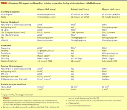 Information om insamling, testning, preparation, lagring och transfusion av erytrocyter är inhämtad från Socialstyrelsen samt vid intervjuer med sjuksköterskor och läkare vid fem svenska sjukhus (Kalmar, Lund, Umeå, Uppsala, Örebro).