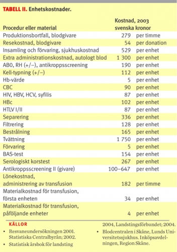 Samhällskostnaden för insamling, testning, preparation, lagring och transfusion av två enheter allogent blod till kirurgipatienter beräknas till 4095 svenska kronor och för autolog transfusion till 5394 kronor, baserat på uppgifterna i Tabell I och II. Motsvarande kostnader ur ett sjukhusperspektiv uppskattas på samma sätt till 3387 kronor respektive 5065 kronor. Den första enheten är något dyrare än påföljande enheter eftersom blodgruppering av patienten endast behöver utföras en gång per transfusion. Även materialkostnaden är något lägre för den andra enheten.
