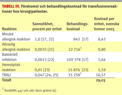 Säkerheten vid blodtransfusion har förbättrats avsevärt de senaste 20 åren och användande av filtrerat (leukocytbefriat) blod minskar sannolikheten för olika typer av transfusionskomplikationer enligt flera studier [10, 11]. Olika studier rapporterar att allogen blodtransfusion är förknippad med risk för olika former av komplikationer; transfusionsreaktioner, överföring av virala infektioner samt postoperativa infektioner [12-15]. Den vanligaste transfusionsreaktionen idag är allergisk reaktion, med symtom såsom utslag och feber. Den allvarligaste reaktionen rapporteras vara TRALI (Transfusion Related Acute Lung Injury), vilken kännetecknas av lungödem. I Tabell III summeras sannolikheter och kostnader för transfusionsreaktioner förknippade med allogen blodtransfusion till kirurgipatienter, baserade på befintlig litteratur.