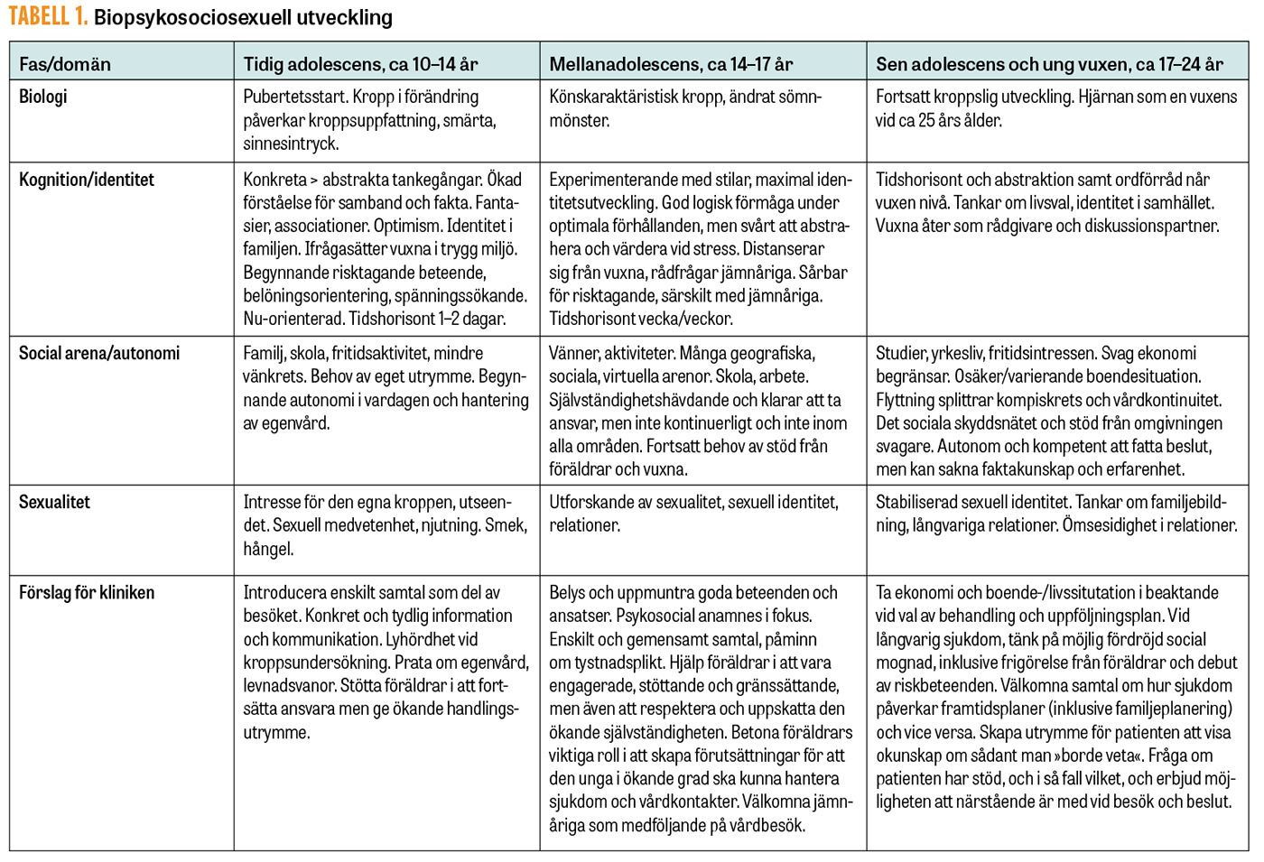 Under och efter puberteten sker en omfattande fysisk, psykisk, social och sexuell utveckling som inte enbart påverkas av könshormoner [1]. Denna förutsägbara utveckling mellan ca 10 och 24 års ålder har betydelse för vård och hälsa inom allt från levnadsvanor till läkemedelsmetabolism, från smärtupplevelse till suicidrisk [2]. I kliniska situationer bör varje område beaktas, det vill säga biologisk utveckling (kroppens strukturella och funktionella förändring), psykologisk utveckling (identitet, kognitiva och exekutiva funktioner), social utveckling (sociala arenor och vänskapsrelationer) samt sexuell utveckling (sexuell identitet, könsuttryck och romantiska relationer). Bedömningen krävs för att kunna anpassa handläggning och kommunikation samt avgöra beslutsförmåga eller behov av stöd från närstående [3]. Otakt mellan utvecklingsområden kan också bidra till ohälsa [4]. Biopsykosocial utveckling delas in i tre faser med något överlappande övergångar (Tabell 1): Tidig adolescens (ca 10–14 år), mellanadolescens (ca 14–17 år) och sen adolescens/ung vuxen ålder (ca 17–24 år) [1].