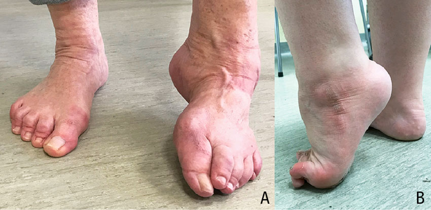 Figur 2. A. Fotdeformitet innefattande spetsfot, varus, cavus och adductus hos individ med stroke. Fotställningen beror av spasticitet i triceps surae, tibialis posterior och anterior. Stortån står i flexion på grund av ökad tonus i flexor hallucis longus. B. Fotdeformitet innefattande spetsfot och klotår.