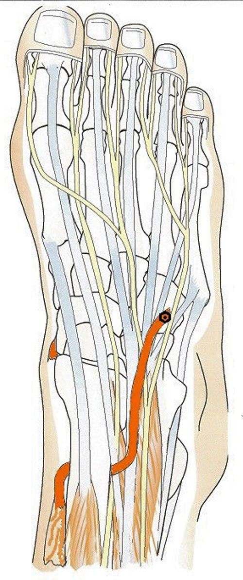 Figur 4. STATT (split tibialis anterior tendon transfer) − principskiss. Tibialis anterior delas i två halvor, varvid den laterala halvan av senan dras ner genom extensor digitorum longus senskida och fästes på fotryggen i ett mellanfotsben lateralt. Illustration: Göran Paulsson