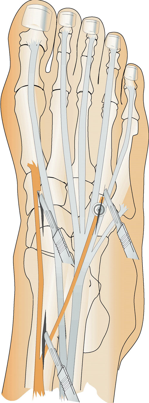 Den vanligaste senförflyttningen som utförs vid droppfot är en tibialis posterior-transferering [14-17]. Tibialis posterior delas distalt där den fäster i mellanfoten, och stumpen dras via ett nytt snitt upp mer proximalt på underbenet. Genom membrana interossea förs senan över från dorsalsidan av tibia till ventralsidan och sedan ner genom senskidan till den långa tåsträckarmuskeln samt fästs på fotryggen i ett mellanfotsben. Från att ha varit en fotböjare blir tibialis posterior genom senförflyttningen en aktiv fotlyftare (dorsalextenderare), Figur 3.