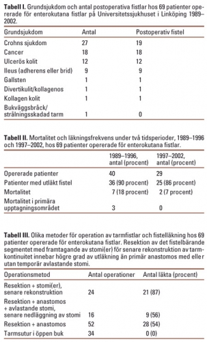 I Universitetssjukhusets primära upptagningsområde (under perioden ca 160000 invånare) opererades i genomsnitt 2,3 fall årligen, vilket ger en incidens av 1,4 fall per 100000 invånare och år. I 59 fall , dvs 86 procent, var fistlarna postoperativa och debuterade inom sex månader efter tidigare bukkirurgi. De orsakades av anastomosläckage eller dissektionsskada på tarm (Tabell I).