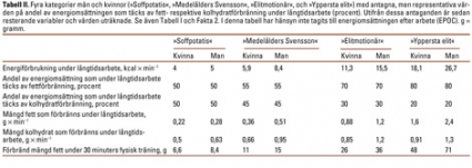 Som framgår av Tabell II är det, trots att vi väljer likartad subjektiv arbetsintensitet och arbetar fysiskt lika lång tid (30 minuter), en mycket stor skillnad (faktor 10) i mängd förbränt fett mellan individer med extremt hög (71 g) respektive låg fysisk prestationsförmåga (7 g).