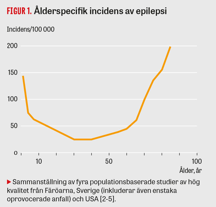 Den högsta risken att insjukna i epilepsi har småbarn, framför allt under första levnadsåret, samt äldre från 65 år [2-5] (Figur 1). Årligen nyinsjuknar över 1 000 barn och över 3 000 vuxna i epilepsi. Den U-formade åldersspecifika incidenskurvan visar lägst incidens för personer i 30–40-årsintervallet. De flesta studier visar en något högre incidens, och även prevalens, hos pojkar och män jämfört med flickor och kvinnor, men skillnaderna i epilepsiförekomst mellan könen är liten.