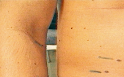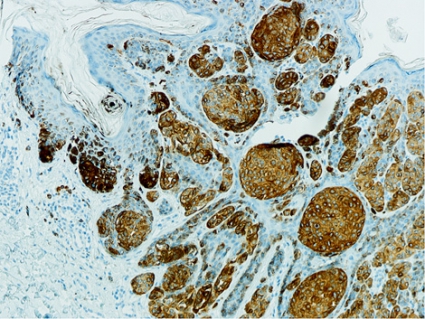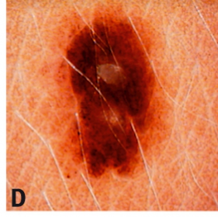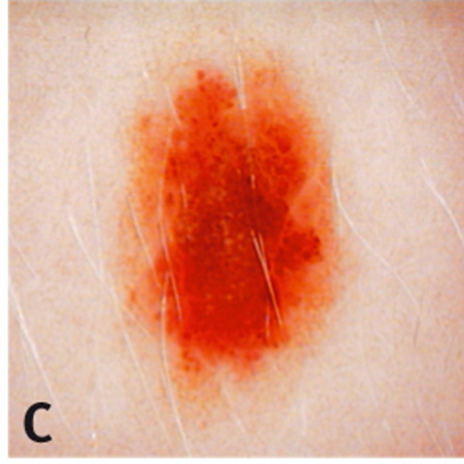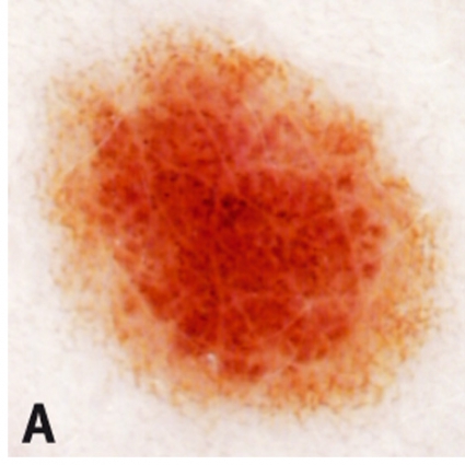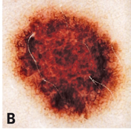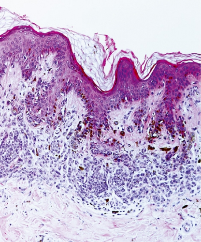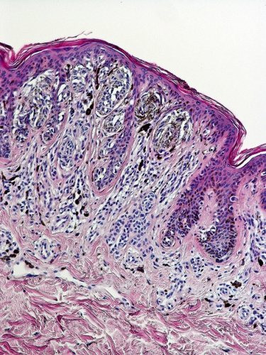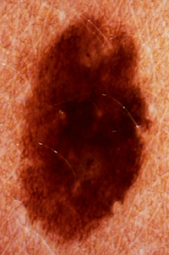 Vid besöket var patienten onaturligt brun för årstiden. Multipla, svarta, välavgränsade nevi, distribuerade över hela kroppen men framför allt i ansikte, hårbotten, bål och övre extremiteter, noterades (Figur 1). Det största och mest aktiva, förmodligen nyuppkommet, på ryggen opererades bort. Mikroskopi avslöjade ett dysplastiskt nevus (Figur 2). Efter läkarbesöket upphörde patienten med injektionerna. Vid kontroll i mars 2012 hade samtliga nevi bleknat och visade benign karaktär vid dermatoskopi.