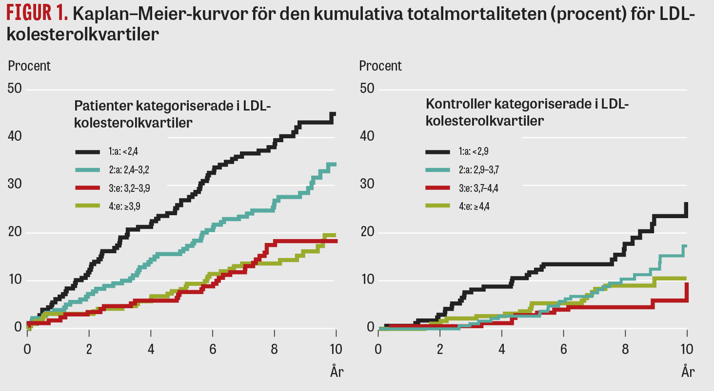 Figur 1 visar LDL-kolesterolnivåns betydelse för långtidsöverlevnaden hos infarktpatienter respektive kontroller. Patienternas mortalitet avtog monotont med högre kvartil, medan kontrollernas avtog på samma sätt för att sedan öka i den översta kvartilen.