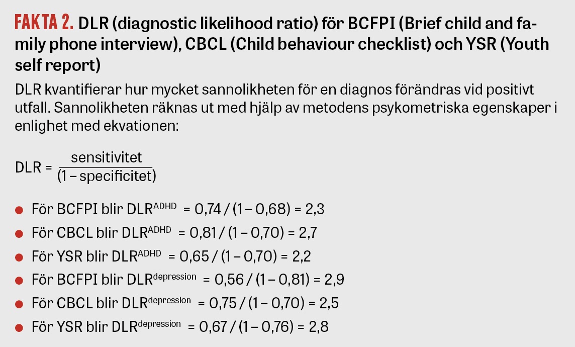 Sensitivitet och specificitet vid olika diagnoser finns angivna för vanliga utredningsinstrument inom BUP, till exempel BCFPI (föräldraskattning), CBCL (Child behaviour checklist; föräldraskattning) och YSR (Youth self report; skattning av barn/ungdom) [12, 13]. Dessa instrument mäter många olika symtom och tillstånd, men samma uppgifter finns för skalor utformade för specifika tillstånd, till exempel ADHD [14], ångestsyndrom [15] och depression [16]. Sannolikhetskvoten är speciellt användbar när flera utredningsmetoder behöver kombineras för att uppnå träffsäkerhet.
