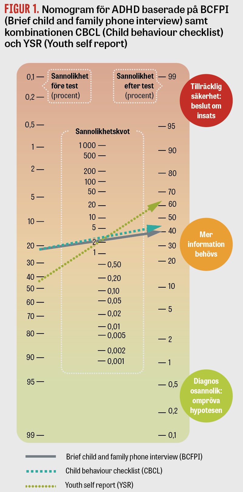I Figur 1 visar vi med ett nomogram hur ett positivt utfall för ADHD på BCFPI påverkar sannolikheten för faktisk diagnos. Till vänster för vi in prevalensen/sannolikheten i patientpopulationen (22 procent, enligt Högberg et al). Sedan dras ett streck genom DLR-värdet (mittenaxeln). Där pilen markerar på axeln till höger ligger den uppdaterade sannolikheten. Vi ser att pilen indikerar en sannolikhet på cirka 40 procent, precis som när vi räknade för hand. Vid kombinationen CBCL och YSR följer vi samma principer. Vi börjar på 22 procent och drar strecket genom DLR för CBCL. Den uppdaterade sannolikheten blir cirka 43 procent. När vi lägger till YSR uppdaterar vi sannolikheten till vänster med vår nya sannolikhet (43 procent) och drar ett streck genom DLR för YSR. Den uppdaterade sannolikheten blir cirka 62 procent.