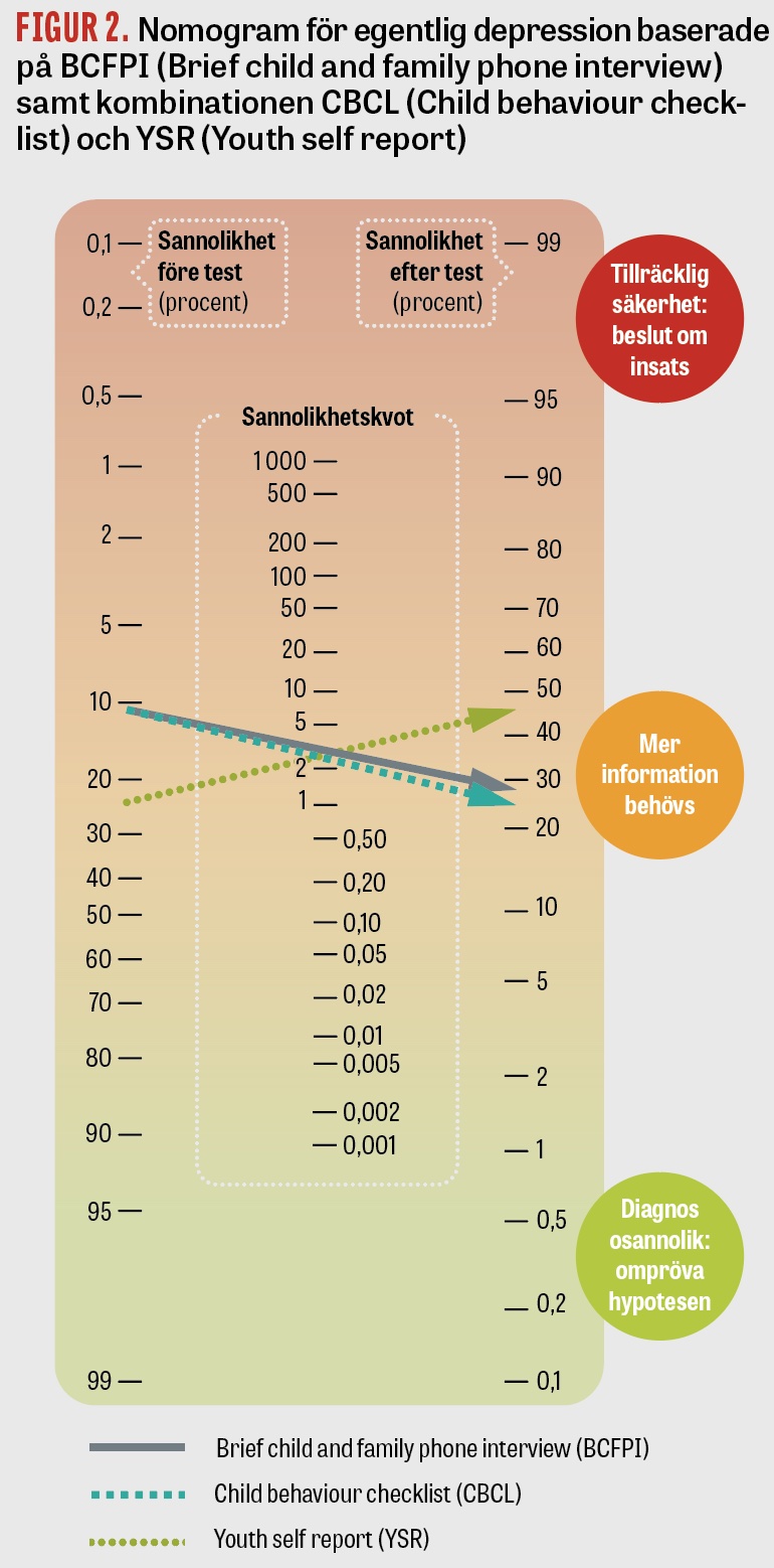 I båda dessa exempel visar nomogrammet för BCFPI dilemmat med att förlita sig på enbart föräldern, medan kombinationen CBCL och YSR illustrerar nyttan av information från såväl förälder som patient. Exemplen visar också att inte ens en kombination av patient- och föräldraskattade metoder med relativt goda psykometriska egenskaper uppnår sannolikheter som är tillräckligt höga för att ställa en diagnos. Ytterligare utredningsinsatser behövs, men genom att utgå från metodernas kända psykometriska egenskaper tillsammans med nomogram får vi en tydligare vägledning om hur olika instrument kan kombineras för att uppnå en högre tillförlitlighet. Dessutom kan de sammanvägda oddsen för till exempel depression visa vad som inte får missas, till exempel en suicidriskbedömning. Här bör det noteras att en av de viktigaste metoderna vid psykiatrisk diagnostik är en semi- eller helstrukturerad diagnostisk intervju, till exempel K-SADS (Kiddie schedule for affective disorders and schizophrenia), ADIS (Anxiety disorders interview schedule) eller MINI. Intervjuer som sker utan stöd av sådana hjälpmedel är inte tillförlitliga ‒ något som noterats i såväl internationella [2] som svenska studier [21]. Icke-strukturerade diagnostiska intervjuer utgör därför endast ett begränsat bidrag i den diagnostiska processen, vilket enkelt kan visas med hjälp av nomogram. I exemplen för ADHD och depression skulle en icke-strukturerad diagnostisk intervju inte medföra någon märkbar skillnad för sannolikheterna för de två diagnoserna. För att uppnå patientsäker screening och diagnostik är det därför viktigt att använda metoder med kända och för ändamålet goda psykometriska egenskaper.