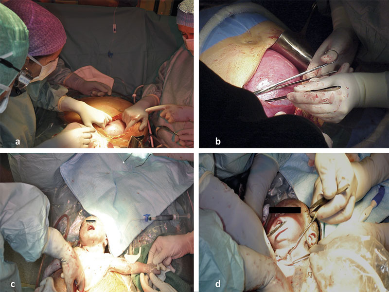 Figur 1. a: Laparotomi och hysterotomi via en låg tvärincision. b: kartlägging av placenta före incision. c: Exponering av barnets huvud och ena armen, infart. Kontinuerlig infusion av kristalloid. d: Trakeostomi under uteroplacentalstöd.