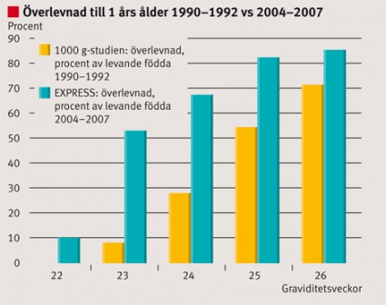Figur 1 belyser den snabba ökning av överlevnaden som ägt rum på mindre än 15 år. Jämfört med 1 000 g-studien har överlevnaden ökat vid alla graviditetslängder, men ökningen är markant vid 23–24 veckor, där i medeltal 14,5 barn per år i 1 000 g-studien överlevde [2] jämfört med 50 barn per år i EXPRESS-studien. EXPRESS-studien rapporterar också överlevnad vid 22 veckor [3].