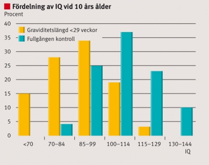 En sydsvensk kohort bestående av barn födda vid 24–28 graviditetsveckor under åren 1985–1986 följdes upp vid 10 års ålder och jämfördes med fullgångna kontrollbarn, 58/65 (89 procent) deltog [23]. Vid kognitiv bedömning med WISC-III (Wechsler intelligence scale for children) var IQ-medelvärde hos de prematurfödda 90 och hos kontrollbarnen 106; 15 procent av de prematura barnen hade IQ <70 (Figur 2). Visuell perception undersöktes med VMI (Visual-motor integration) [24]. De prematurfödda hade vid 10 års ålder en perceptuell mognad motsvarande den för 8-åringar. Beteende undersöktes med CBCL (Child behavior checklist) [25]. En tredjedel av de underburna barnen och var tionde kontroll hade manifesta beteendeproblem; 20 procent av de prematurfödda barnen och 8 procent av kontrollerna hade ADHD. Lärare bedömde barnens skolprestationer i fyra kärnämnen, och de underburna barnen presterade signifikant sämre inom dessa ämnen; 40 procent bedömdes vara i behov av specialundervisning jämfört med 12 procent av kontrollbarnen. Neurologisk undersökning visade att 5,6 procent av de prematurfödda barnen hade CP, och sammanlagt 13 procent hade större funktionshinder [23].