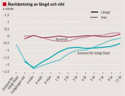 Mekanismer. Extremt för tidig födelse medför att en av de snabbaste tillväxtfaserna i livet avbryts och ersätts med en lång period av relativ malnutrition. Detta visas bl a hos barnen i 1 000 g-studien. De 83 barnen födda före 26 graviditetsveckor tappade 1,7 SD i vikt från födseln till 3 månaders korrigerad ålder. Återhämtningen skedde sedan i jämn takt upp till 11 års ålder, då de var marginellt lättare och kortare än kontrollerna (Figur 3) [41].