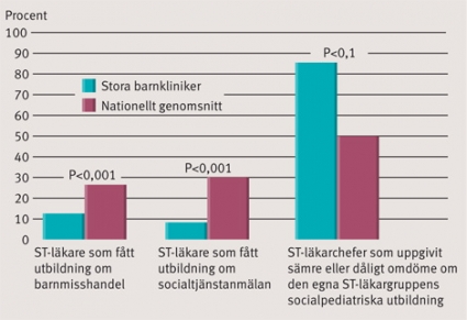 Utbildningsnivå, specialistkompetent år 2008. För nyblivna specialister i pediatrik under år 2008 hade 18 läkare av 51 (35 procent) under sin ST-tjänst genomgått någon form av formaliserad/särskild utbildning om barnmisshandel/vanvård. Totalt 6 ST-läkarchefer var på denna fråga osäkra om utbildningsnivån.