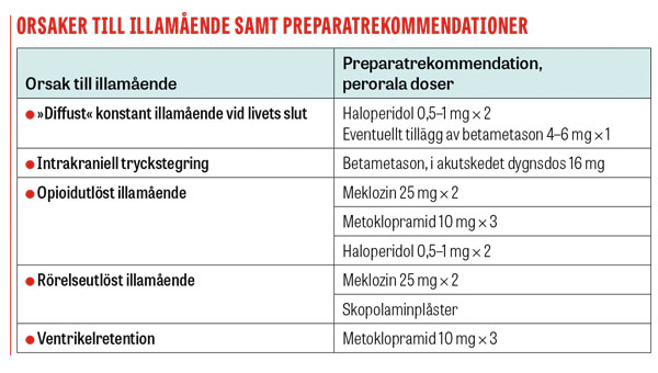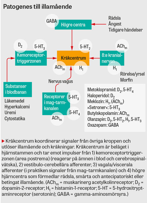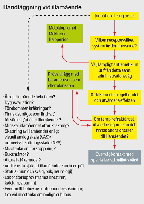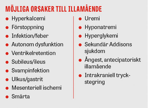 Illamående förekommer hos 40–70 procent av cancerpatienter i palliativt skede [7]. Även hos hjärtsviktspatienter i detta skede är det inte ovanligt med illamående [1]. Orsakerna till illamående är många.