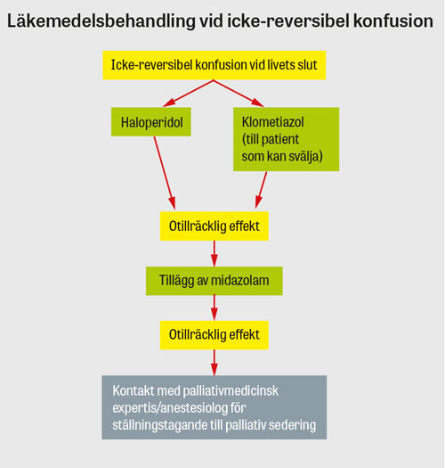 Konfusion är ett komplext tillstånd som ofta kan missas eller feltolkas. Det finns många orsaker och därmed många tänkbara etiologiska behandlingar. Bland de viktigaste orsakerna och de som kan vara föremål för relativt enkla åtgärder hos en patient i slutskedet bör nämnas hyperkalcemi, urinstämma, infektion, utsättning av läkemedel och opioidrotation (byte från en opioid och/eller administrationsmetod till en annan för att uppnå bättre smärtlindrande effekt).