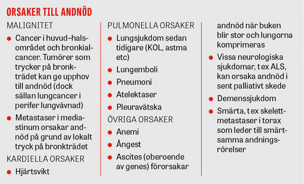 Andnöd är ett av de vanligaste symtomen hos patienter med icke-malign sjukdom i palliativt skede. Andnöd är plågsamt och är för denna patientgrupp ofta vad smärta är för cancerpatienten. Att övervaka saturation eller kontrollera blodgaser hos den döende patienten har ingen plats, utan behandlingen ska styras utifrån den subjektiva upplevelsen av andnöd och den kliniska bedömningen. Enligt en systematisk översikt förekommer andnöd hos 10–70 procent av patienter med cancer, 60–88 procent hos patienter med hjärtsjukdom och hos 90–95 procent av patienter med KOL [1].