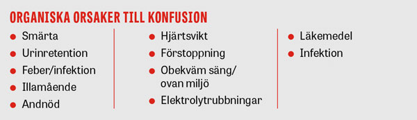 Upp till så mycket som 80 procent av patienter med cancersjukdom är konfusoriska under de sista dagarna eller timmarna i livet. Hos andra patientgrupper i livets slutskede är siffran ca 40 procent [13]. Lindrig konfusion i livets slutskede behöver inte orsaka lidande hos patienten och ska då inte heller behandlas. Hyperaktiv konfusion med motorisk oro och agitation är däremot mycket påfrestande och ska ses som ett akutmedicinskt tillstånd.